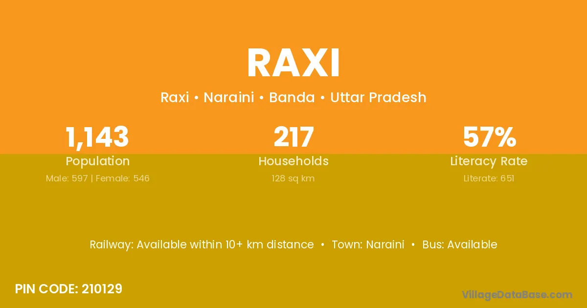 Raxi village has a total population of 1,143 people, of which 597 are males and 546 are females.