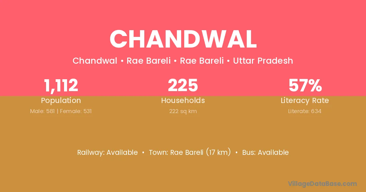 The literacy rate of Chandwal village is 59.63%. Male literacy stands at 67.17% and female literacy at 52.22%.