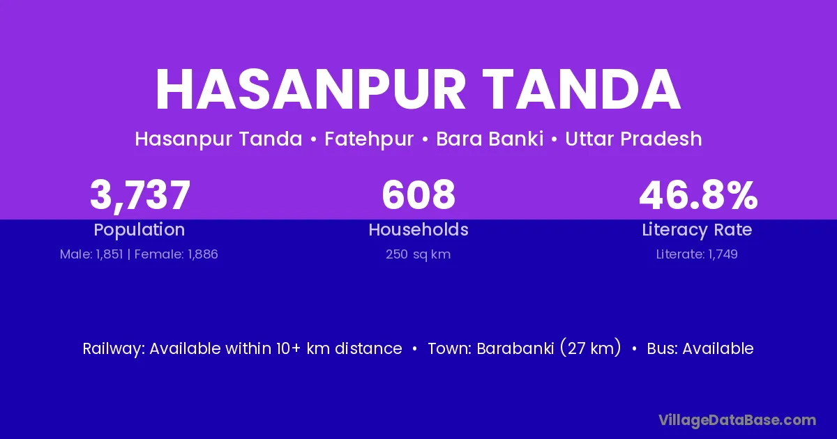 Barabanki (27 km) is the nearest town to Hasanpur Tanda village for major economic activities and is located approximately 27 km away.