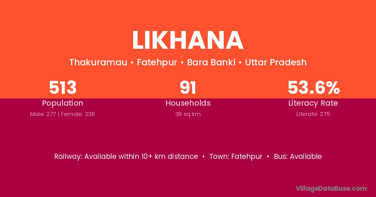 Likhana village has a total population of 513 people, of which 277 are males and 236 are females.