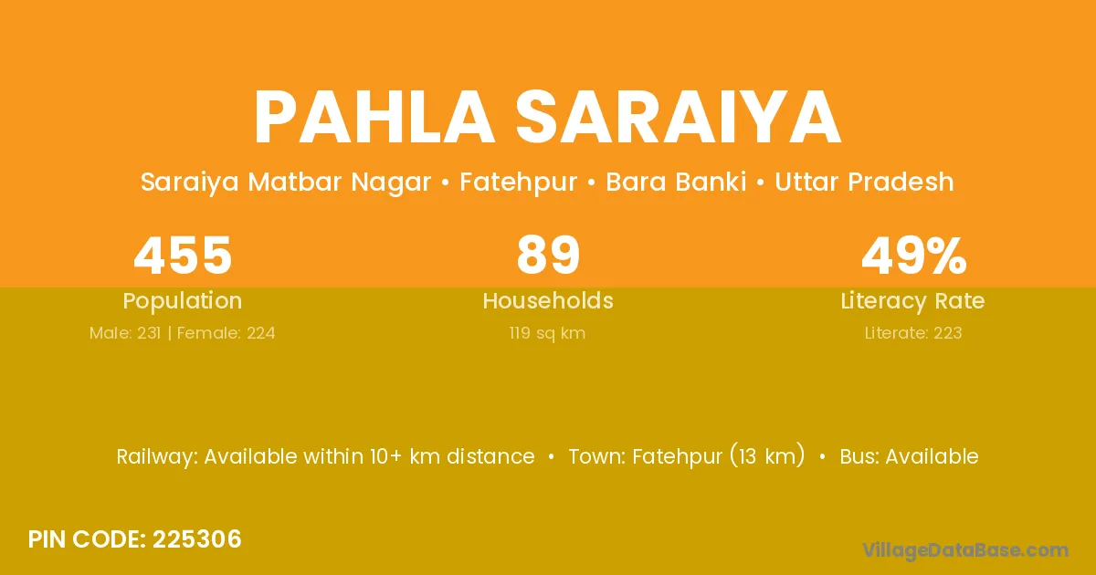 Fatehpur (13 km) is the nearest town to Pahla Saraiya village for major economic activities and is located approximately 13 km away.