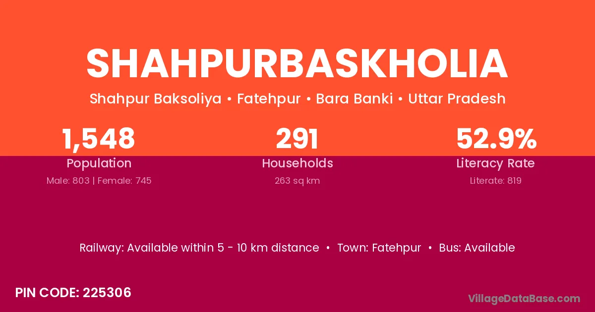 Shahpurbaskholia village has a total population of 1,548 people, of which 803 are males and 745 are females.