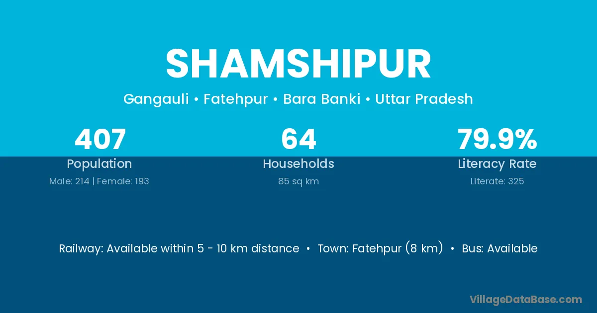 Fatehpur (8 km) is the nearest town to Shamshipur village for major economic activities and is located approximately 8 km away.