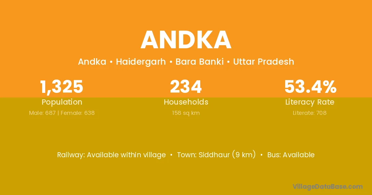 Siddhaur (9 km) is the nearest town to Andka village for major economic activities and is located approximately 9 km away.