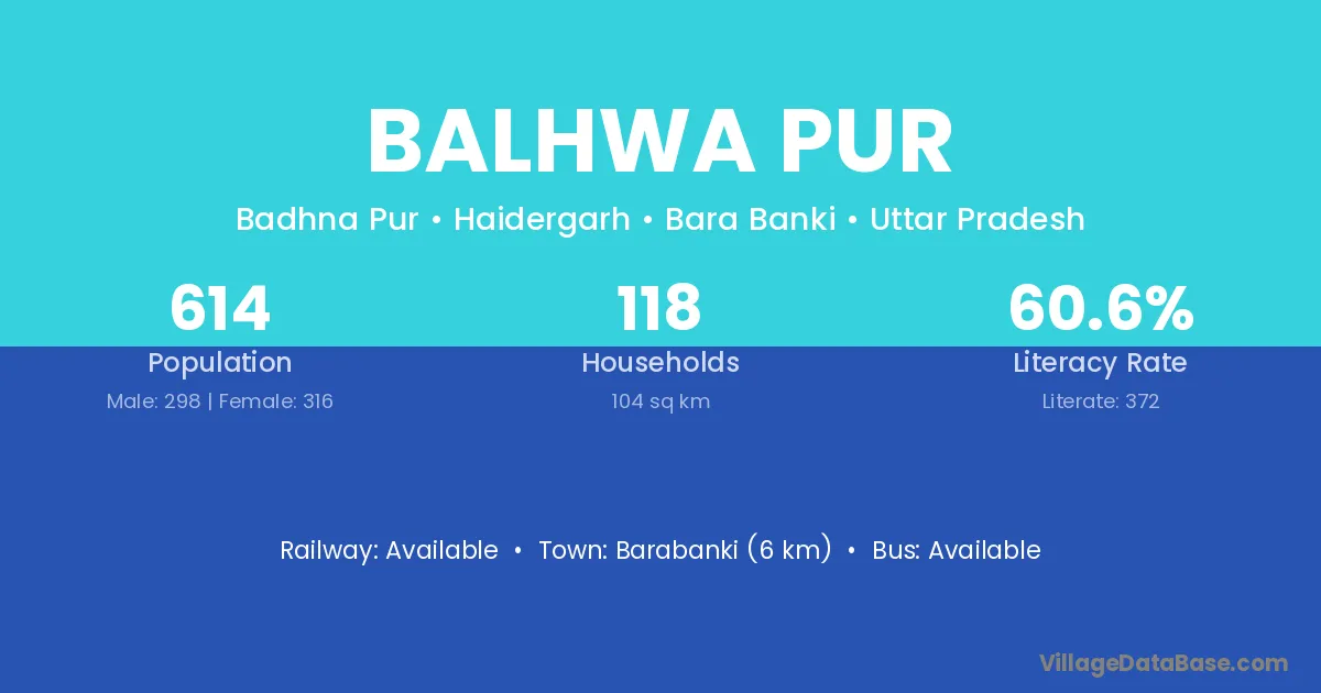 Barabanki (6 km) is the nearest town to Balhwa Pur village for major economic activities and is located approximately 6 km away.