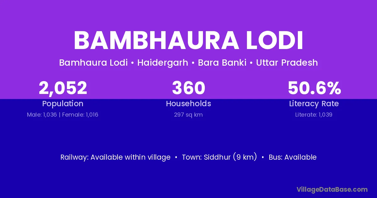 Bambhaura Lodi village has a total population of 2,052 people, of which 1,036 are males and 1,016 are females.