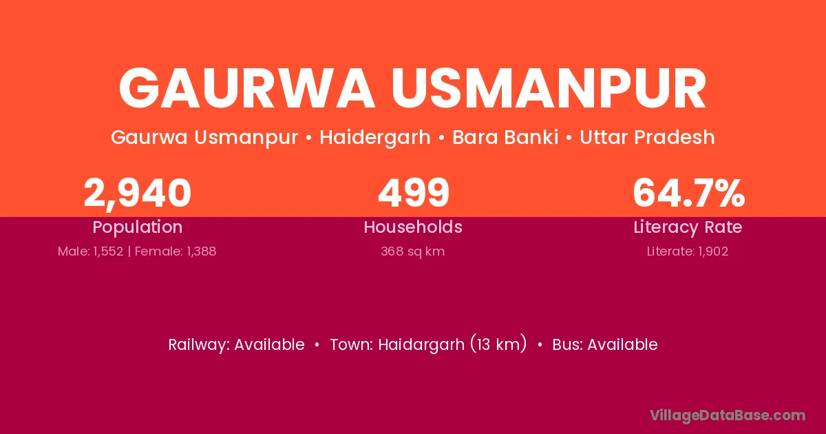 Haidargarh (13 km) is the nearest town to Gaurwa Usmanpur village for major economic activities and is located approximately 13 km away.