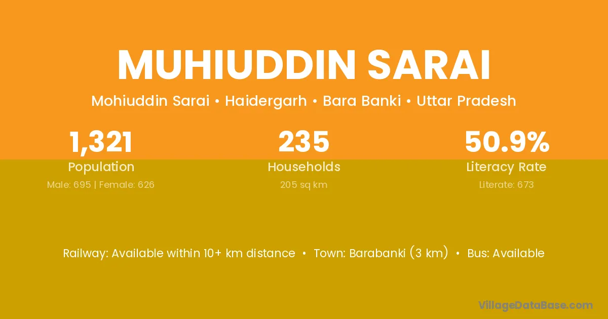 Barabanki (3 km) is the nearest town to Muhiuddin Sarai village for major economic activities and is located approximately 3 km away.
