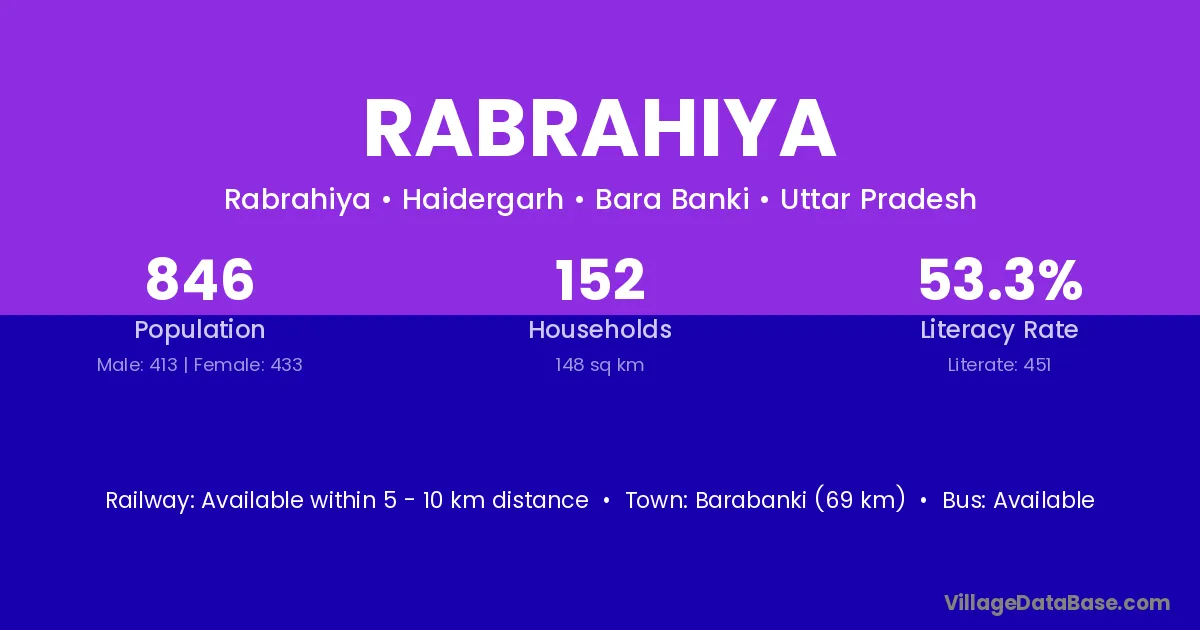 Barabanki (69 km) is the nearest town to Rabrahiya village for major economic activities and is located approximately 69 km away.