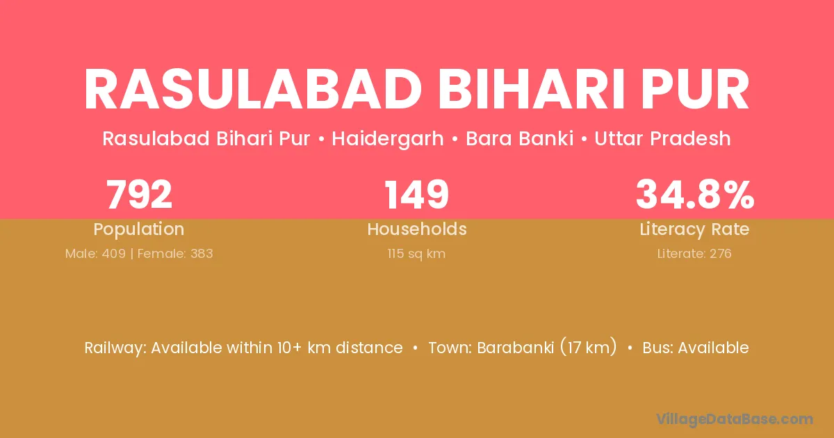 Rasulabad Bihari Pur village has a total population of 792 people, of which 409 are males and 383 are females.