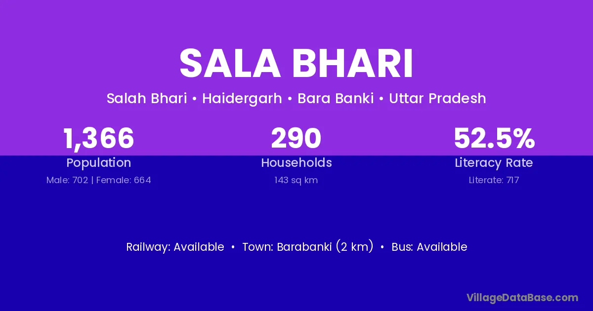 Barabanki (2 km) is the nearest town to Sala Bhari village for major economic activities and is located approximately 2 km away.