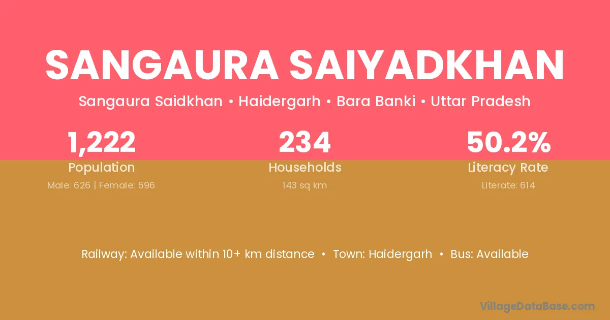 Sangaura Saiyadkhan village has a total population of 1,222 people, of which 626 are males and 596 are females.