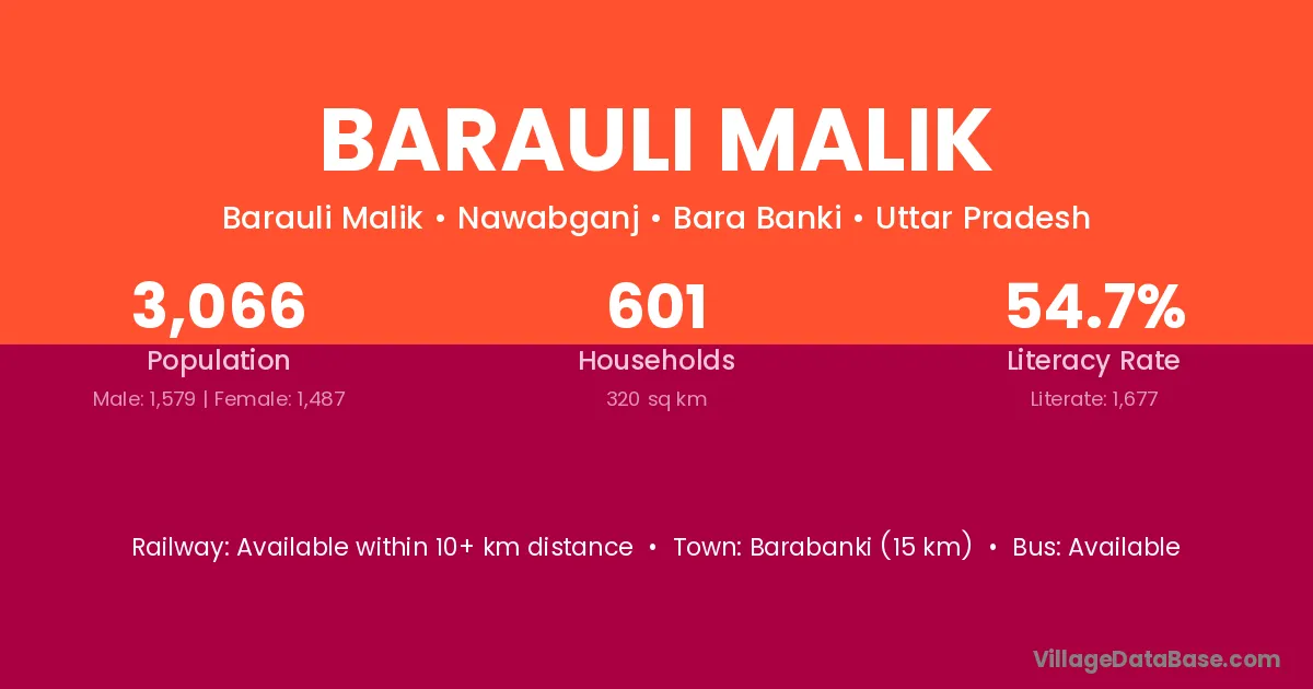 Barabanki (15 km) is the nearest town to Barauli Malik village for major economic activities and is located approximately 15 km away.