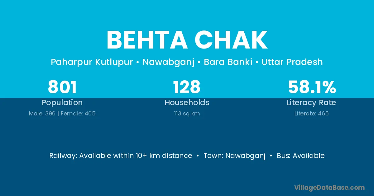 Behta Chak village has a total population of 801 people, of which 396 are males and 405 are females.