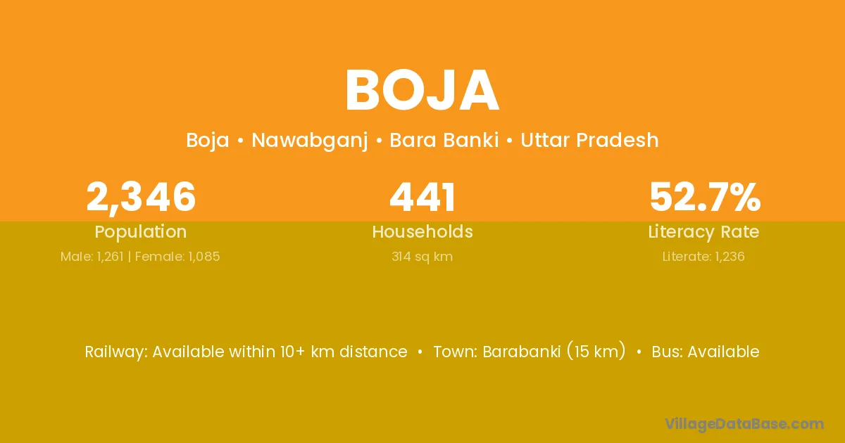 Barabanki (15 km) is the nearest town to Boja village for major economic activities and is located approximately 15 km away.
