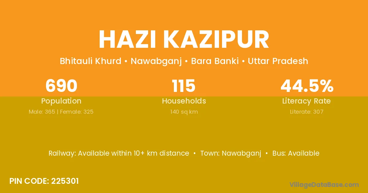 Hazi Kazipur village has a total population of 690 people, of which 365 are males and 325 are females.