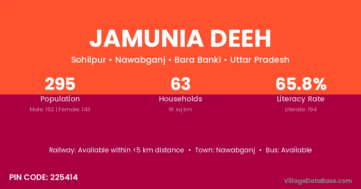 Jamunia Deeh village has a total population of 295 people, of which 152 are males and 143 are females.