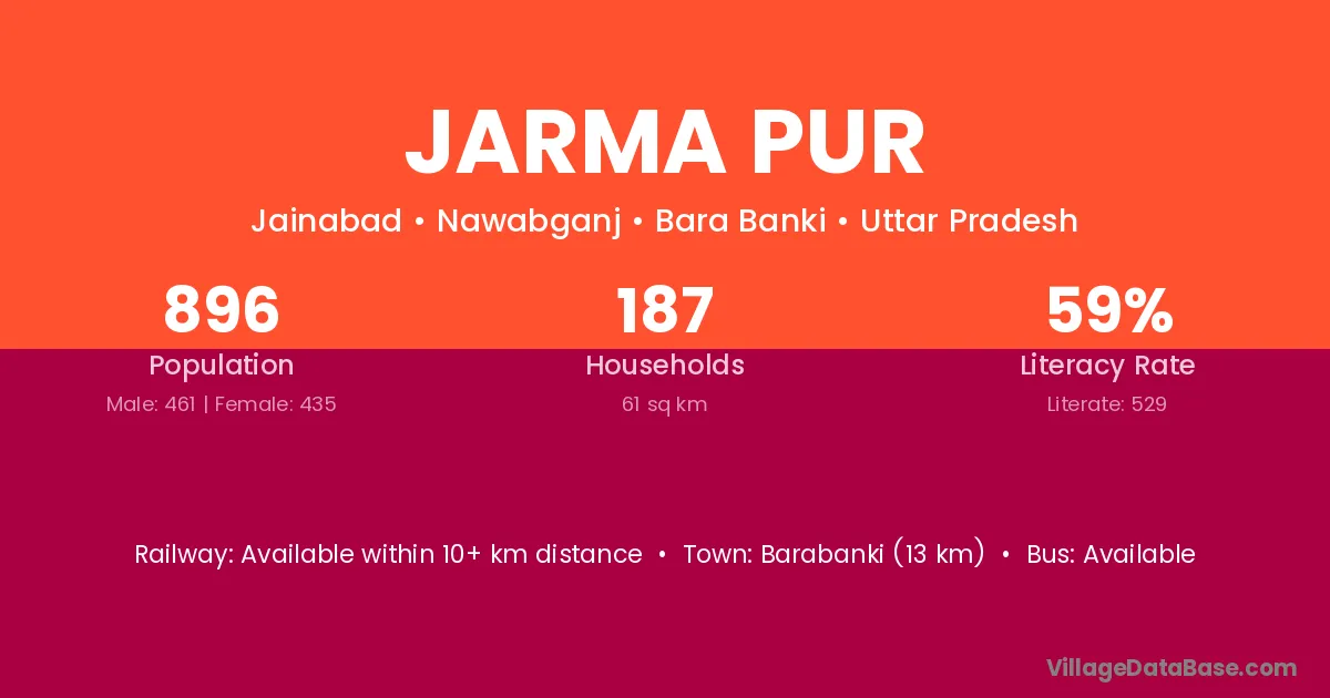 Barabanki (13 km) is the nearest town to Jarma Pur village for major economic activities and is located approximately 13 km away.