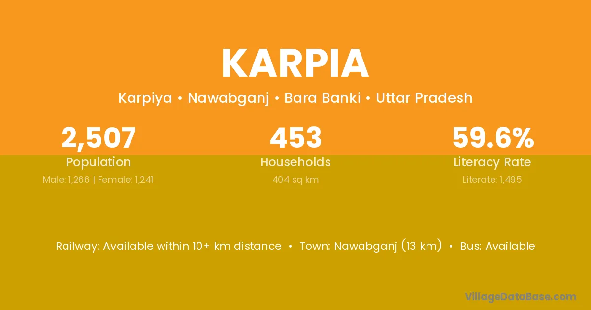 Nawabganj (13 km) is the nearest town to Karpia village for major economic activities and is located approximately 13 km away.