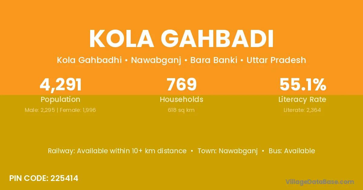 Kola Gahbadi village has a total population of 4,291 people, of which 2,295 are males and 1,996 are females.