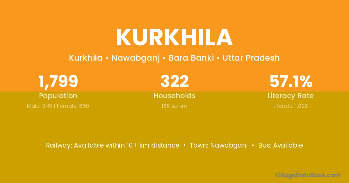 Kurkhila village has a total population of 1,799 people, of which 949 are males and 850 are females.
