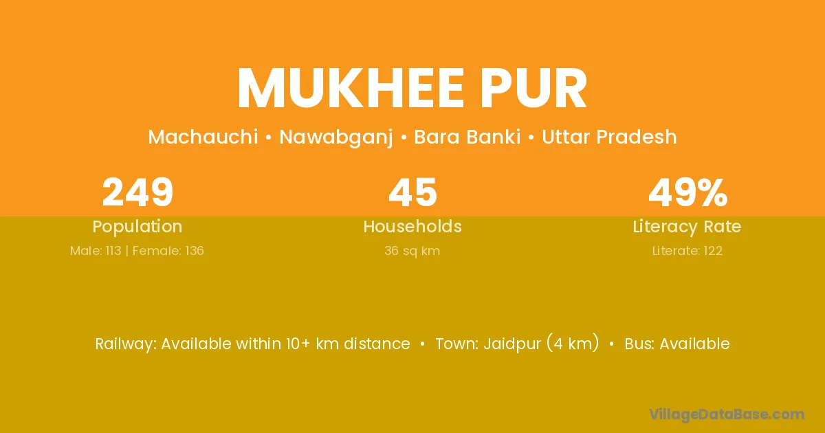 Jaidpur (4 km) is the nearest town to Mukhee Pur village for major economic activities and is located approximately 4 km away.