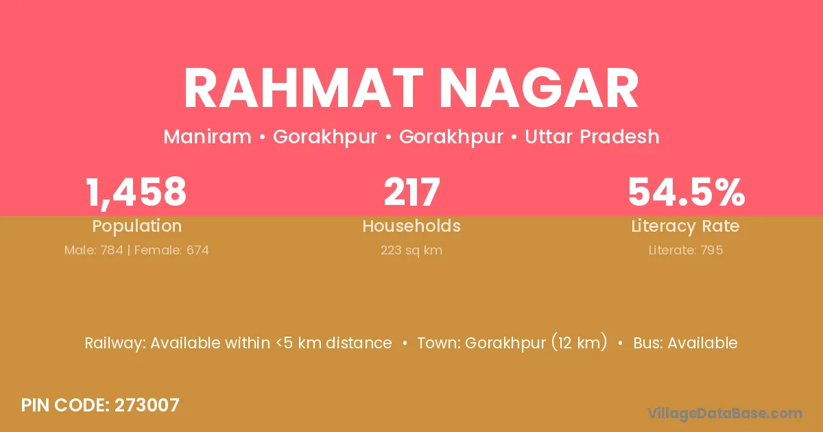 Rahmat Nagar village has a total population of 423 people, of which 222 are males and 201 are females.
