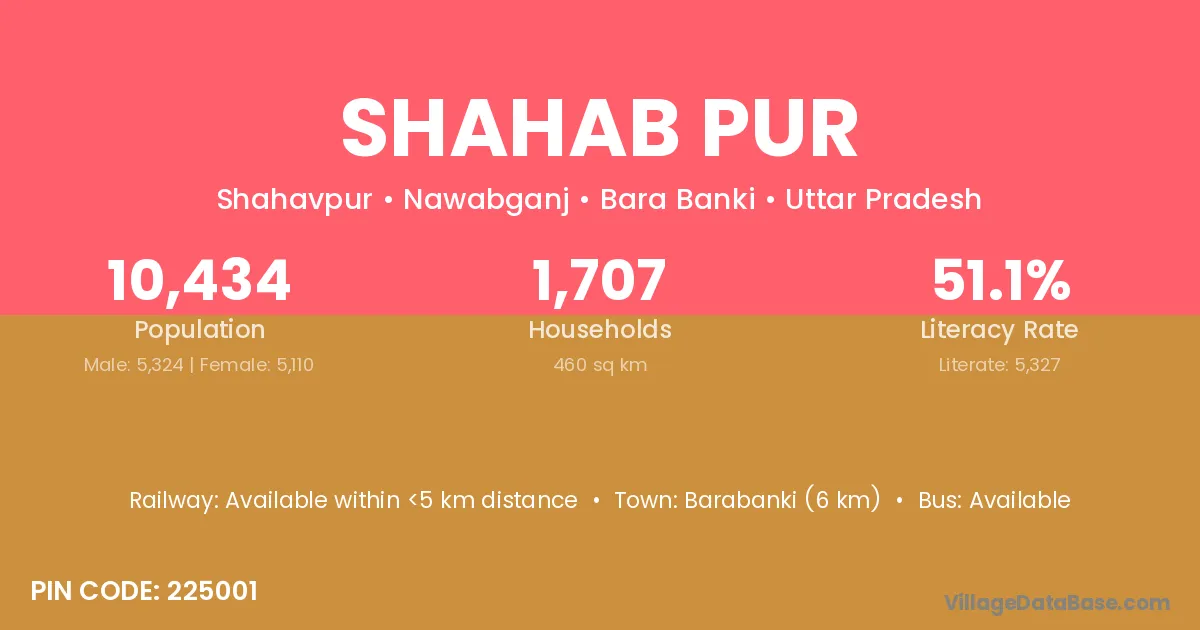 Barabanki (6 km) is the nearest town to Shahab Pur village for major economic activities and is located approximately 6 km away.