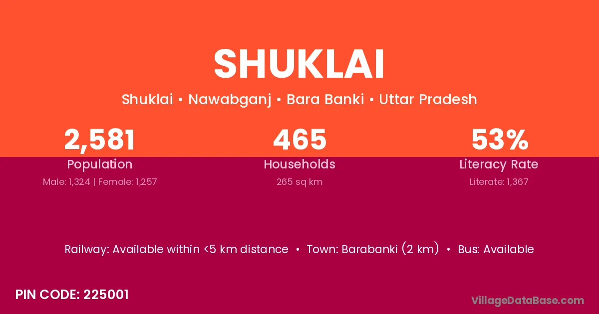 Barabanki (2 km) is the nearest town to Shuklai village for major economic activities and is located approximately 2 km away.