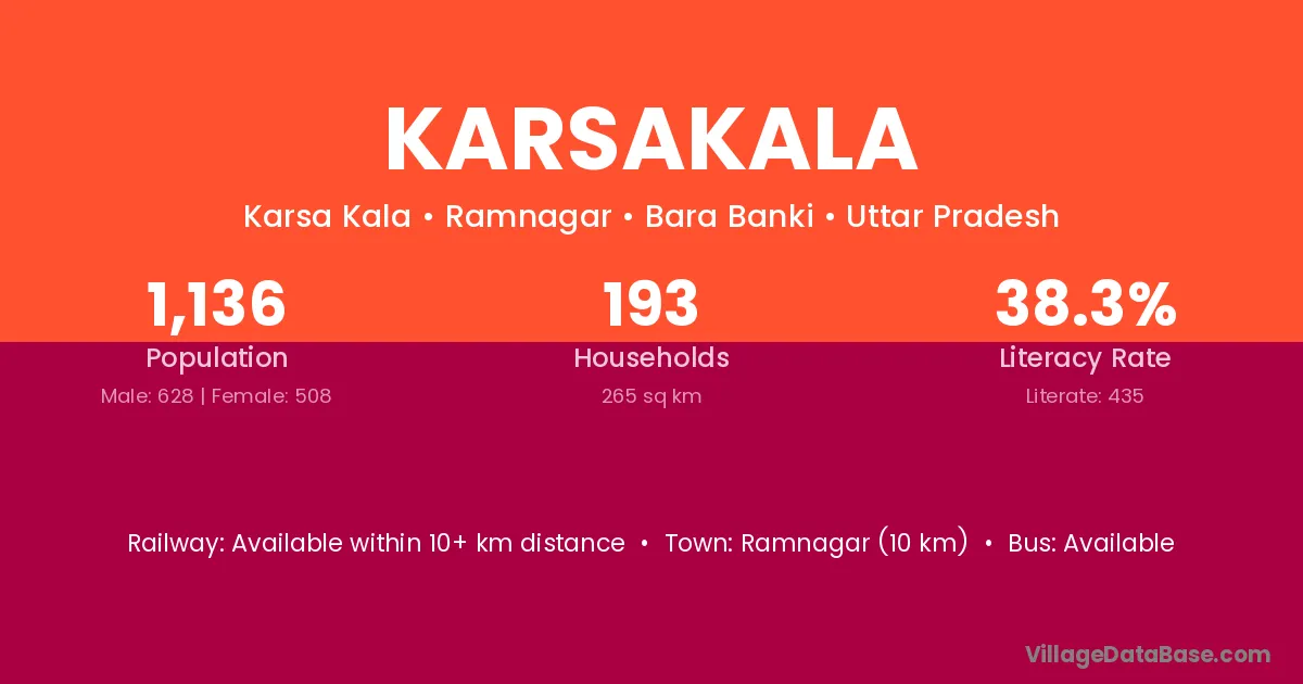 Karsakala village has a total population of 1,136 people, of which 628 are males and 508 are females.