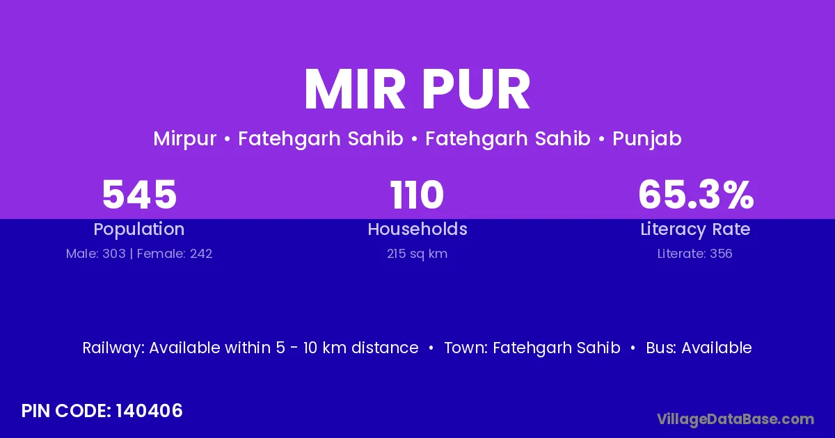 The literacy rate of Mir Pur village is 46.39%. Male literacy stands at 52.39% and female literacy at 39.78%.