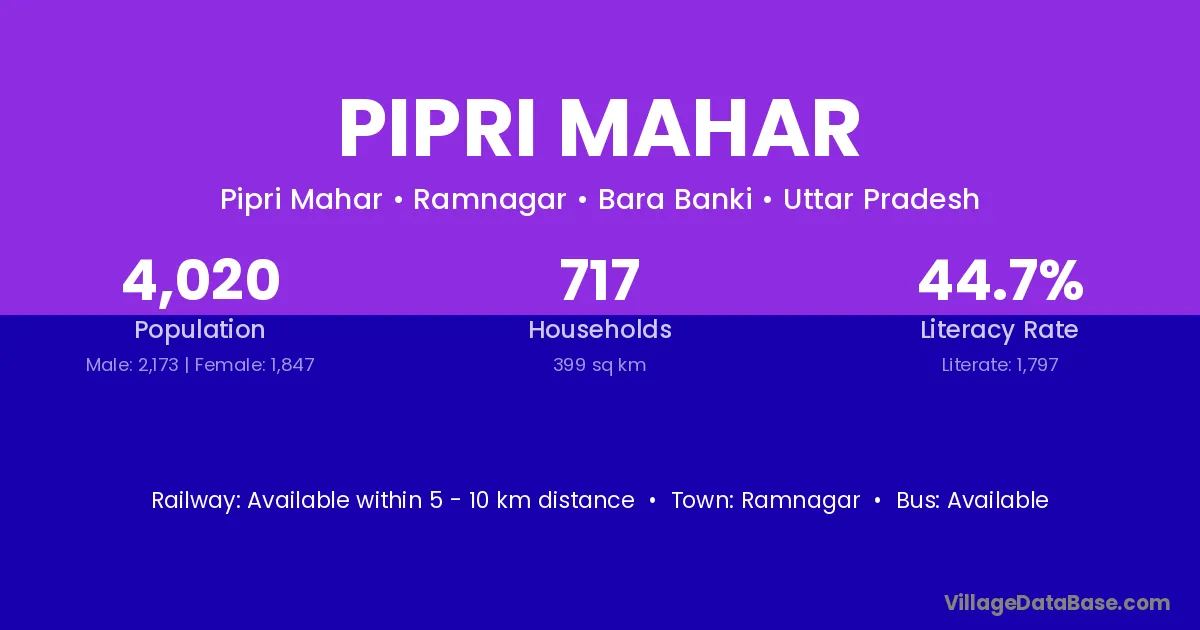 Pipri Mahar village has a total population of 4,020 people, of which 2,173 are males and 1,847 are females.