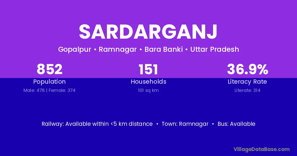 Sardarganj village has a total population of 852 people, of which 478 are males and 374 are females.