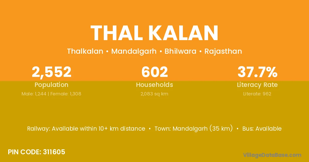 The literacy rate of Thal Kalan village is 60.52%. Male literacy stands at 70.76% and female literacy at 48.02%.