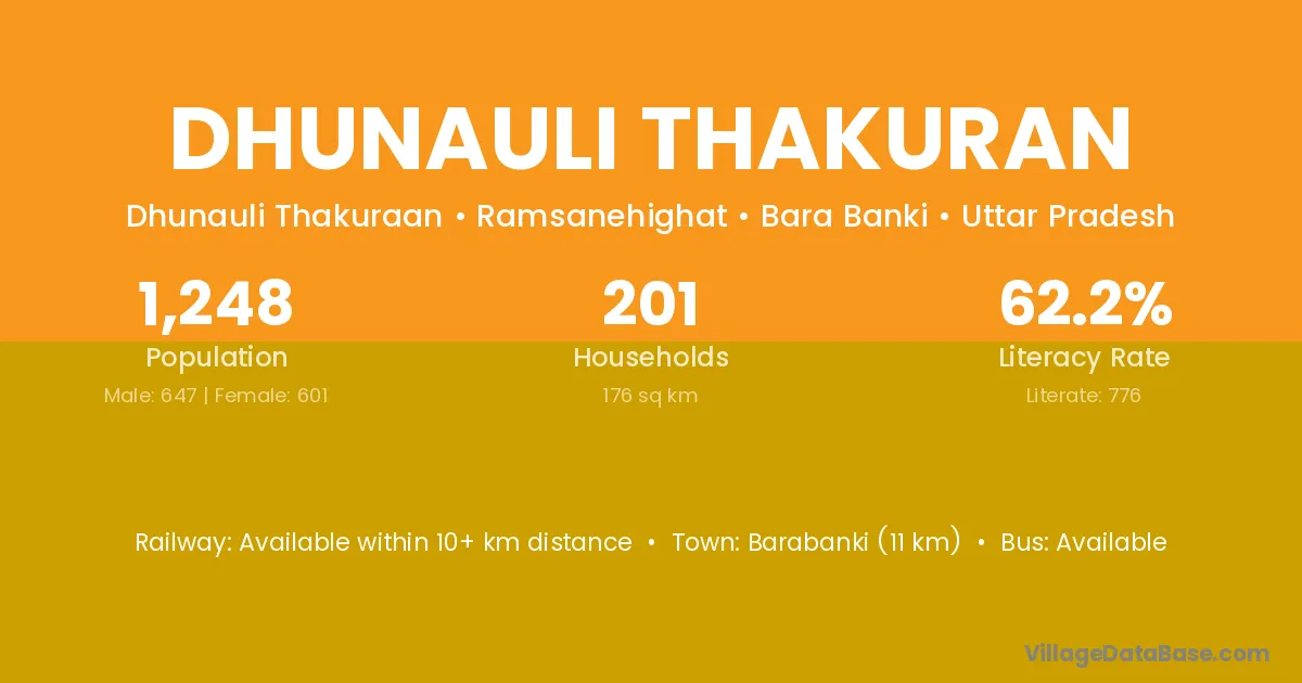 Barabanki (11 km) is the nearest town to Dhunauli Thakuran village for major economic activities and is located approximately 11 km away.