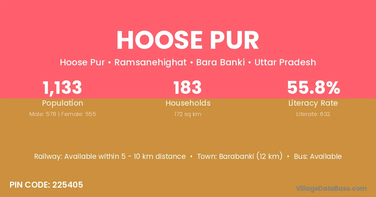 Barabanki (12 km) is the nearest town to Hoose Pur village for major economic activities and is located approximately 12 km away.