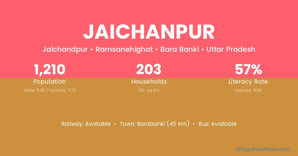 Barabanki (45 km) is the nearest town to Jaichanpur village for major economic activities and is located approximately 45 km away.