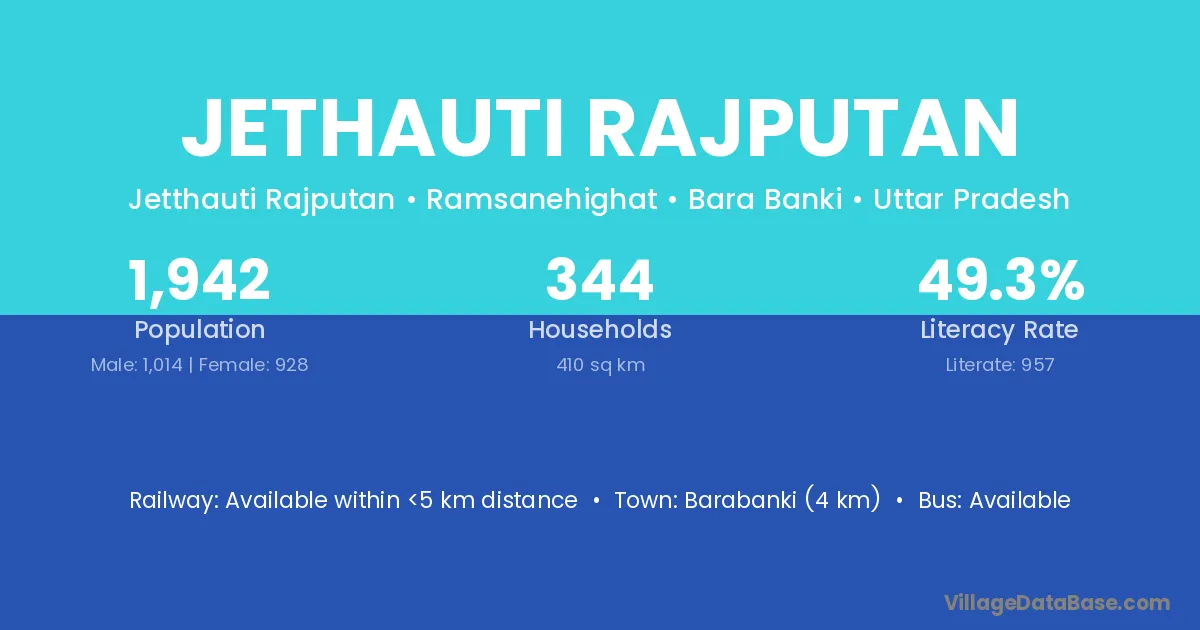 Barabanki (4 km) is the nearest town to Jethauti Rajputan village for major economic activities and is located approximately 4 km away.