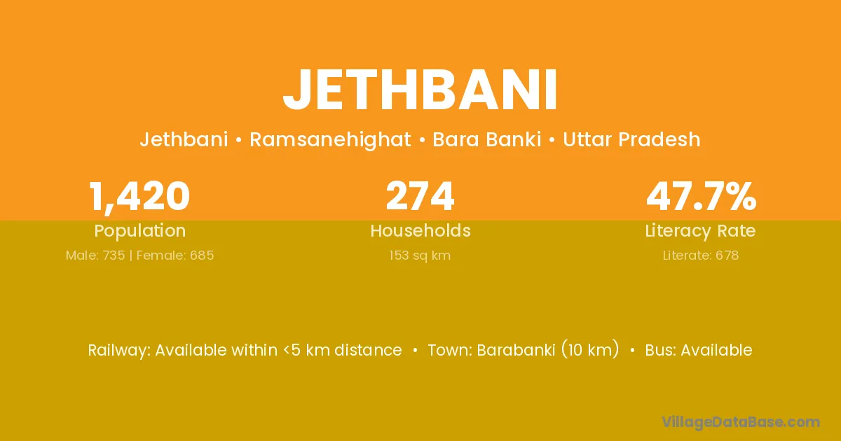 Barabanki (10 km) is the nearest town to Jethbani village for major economic activities and is located approximately 10 km away.