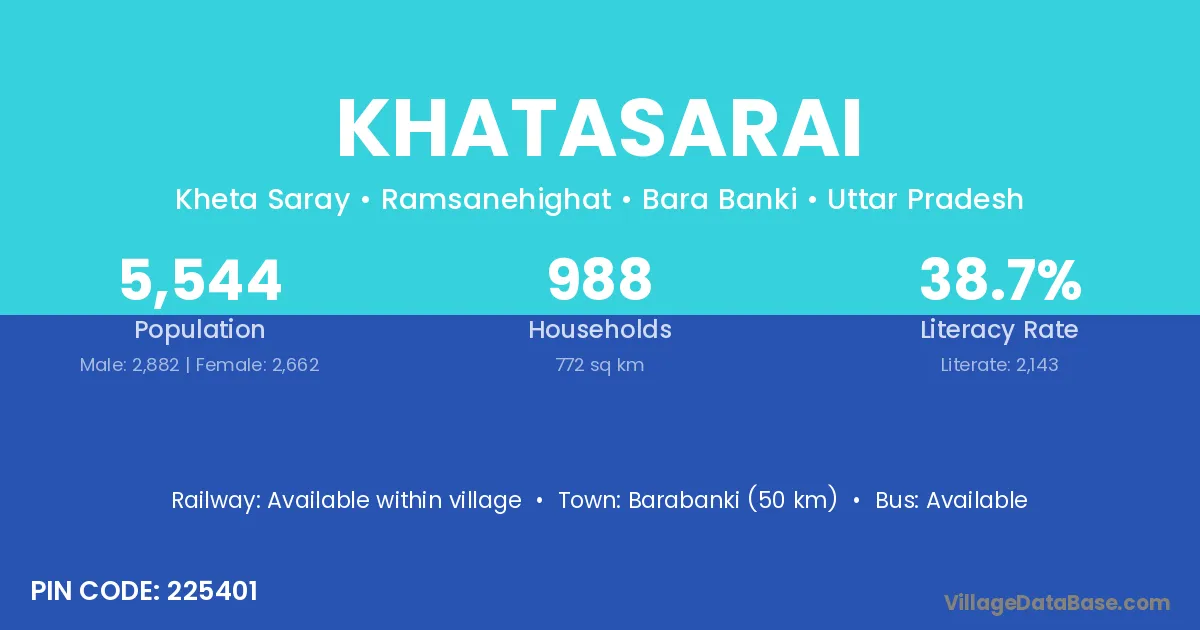 Barabanki (50 km) is the nearest town to Khatasarai village for major economic activities and is located approximately 50 km away.