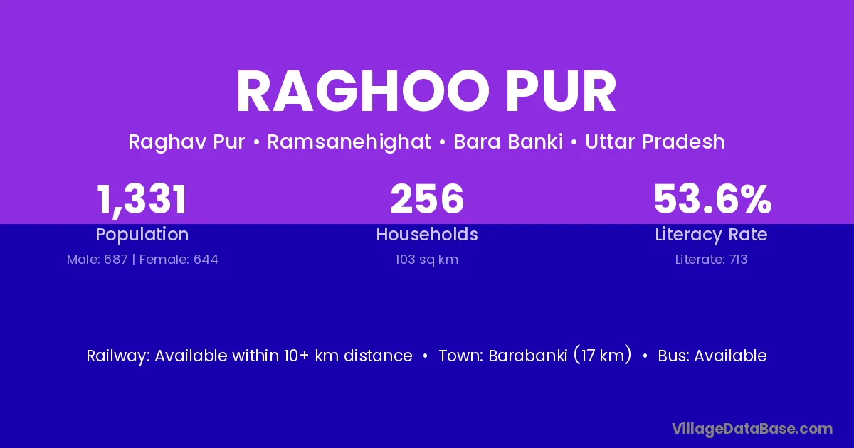 Barabanki (17 km) is the nearest town to Raghoo Pur village for major economic activities and is located approximately 17 km away.
