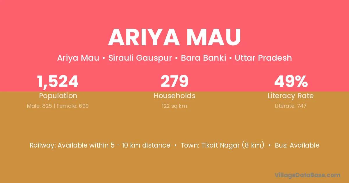 Tikait Nagar (8 km) is the nearest town to Ariya Mau village for major economic activities and is located approximately 8 km away.