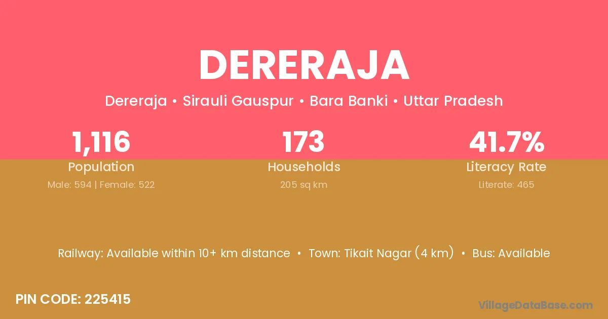 Tikait Nagar (4 km) is the nearest town to Dereraja village for major economic activities and is located approximately 4 km away.
