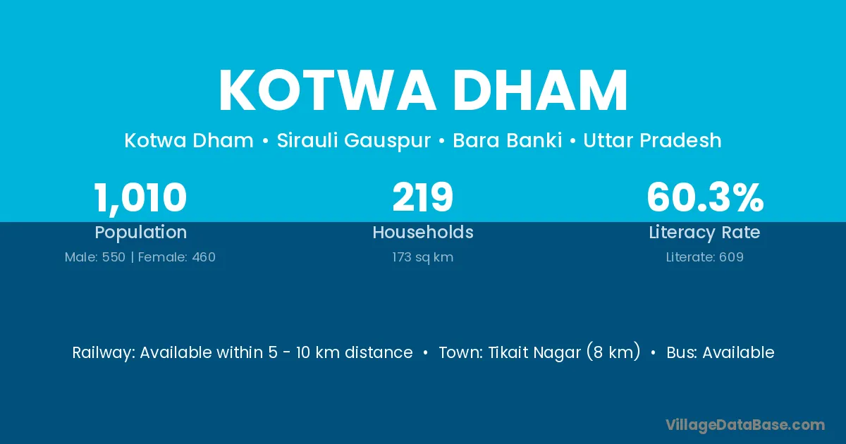 Tikait Nagar (8 km) is the nearest town to Kotwa Dham village for major economic activities and is located approximately 8 km away.