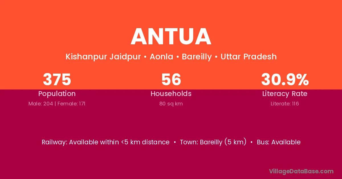 Bareilly (5 km) is the nearest town to Antua village for major economic activities and is located approximately 5 km away.