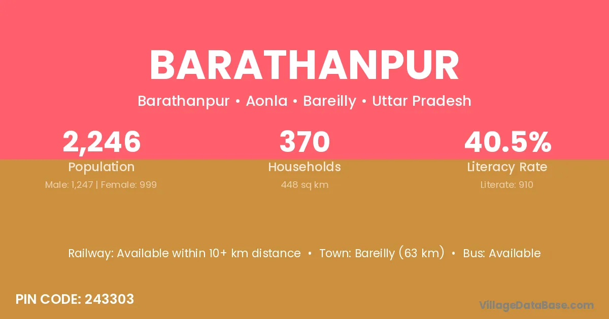 Bareilly (63 km) is the nearest town to Barathanpur village for major economic activities and is located approximately 63 km away.