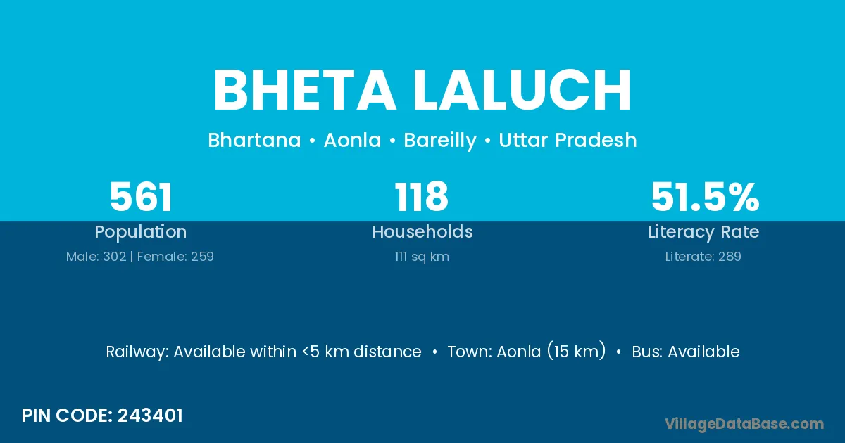 Aonla (15 km) is the nearest town to Bheta Laluch village for major economic activities and is located approximately 15 km away.