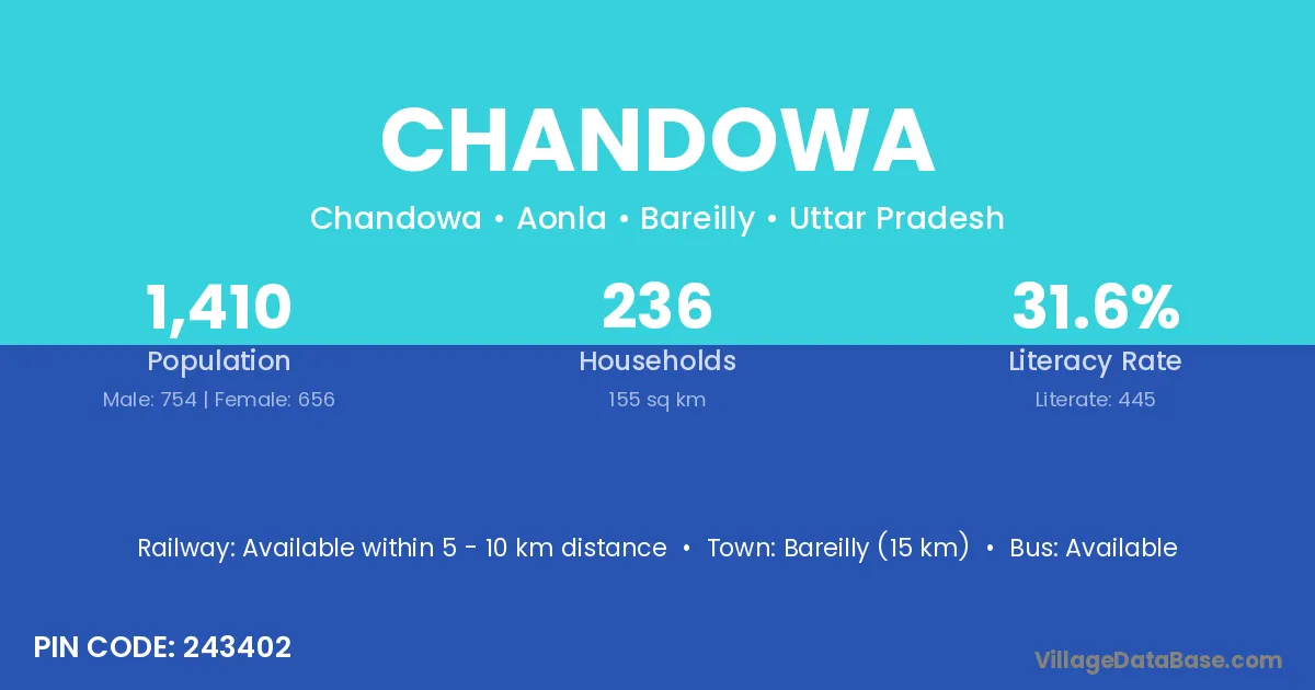 Bareilly (15 km) is the nearest town to Chandowa village for major economic activities and is located approximately 15 km away.