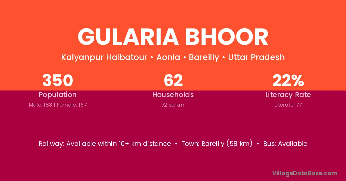Gularia Bhoor village has a total population of 350 people, of which 183 are males and 167 are females.