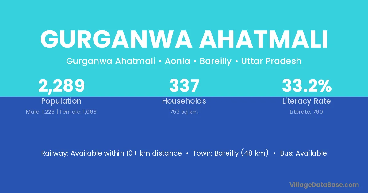 Bareilly (48 km) is the nearest town to Gurganwa Ahatmali village for major economic activities and is located approximately 48 km away.